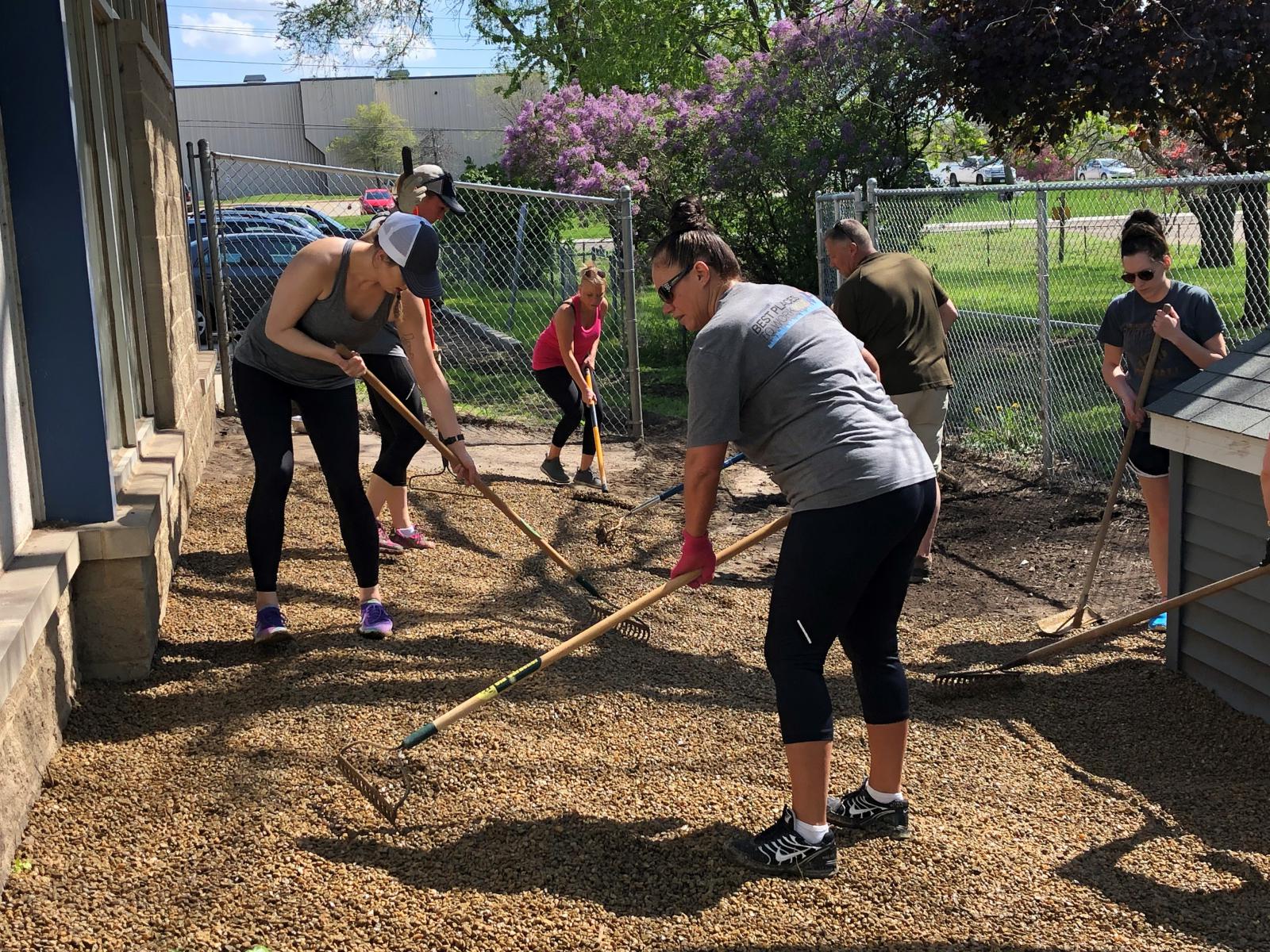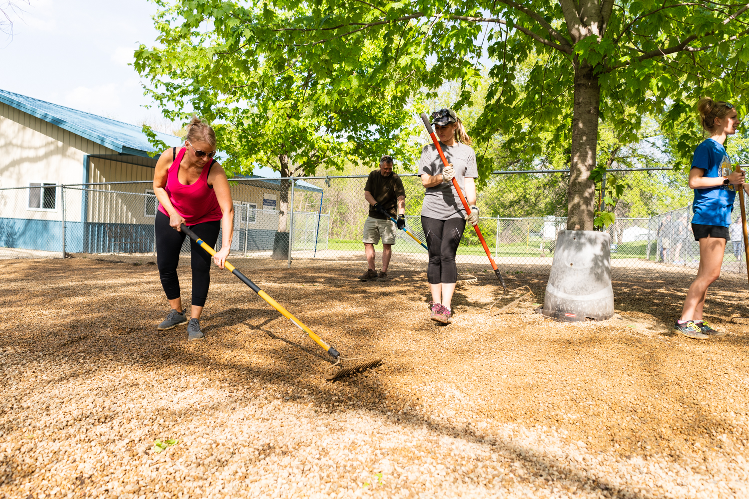 With the funds finally available, the group secured delivery of the gravel and lined up a skid loader operator who also donated his machinery, time, and labor. Three months after initially taking on the task, on May 15, 20+ volunteers spent hours prepping the ground and spreading the gravel over the two large fenced-in spaces.
